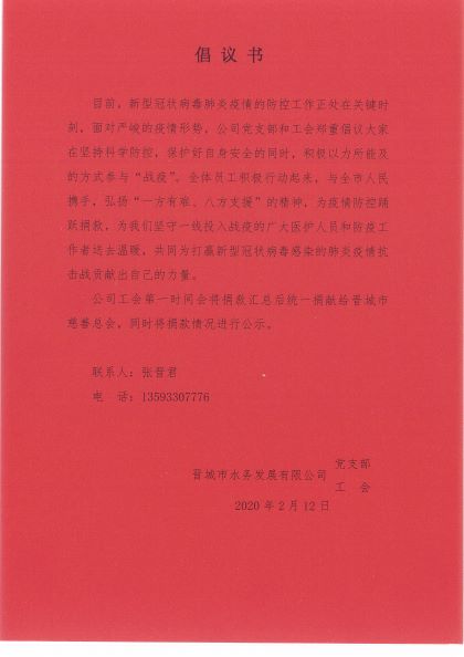 我公司黨支部成立“疫情防控志愿者服務(wù)隊”,配合公司所在社區(qū)進(jìn)行登記、管控、摸排等工作。不僅如此,公司黨支部和工會還聯(lián)合發(fā)出倡議書,鼓勵全體員工積極為一線抗疫捐款,員工們積極響應(yīng),紛紛踴躍捐款,截止目前我公司共收到員工捐款10100元,工會有關(guān)人員已第一時間將員工捐款匯總并送至慈善總會。